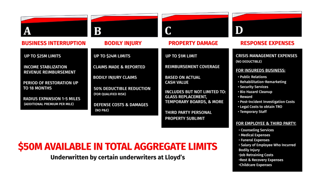 WVA is a multifaceted stand-alone active shooter and violent act coverage created to respond to violent act events, violent act threat events, off-site employee violent events as well as stalking. The policy provides a Period of Restoration up to 18 months for a covered event and provides both first and third-party coverages that include:  business interruption, incident response expenses, third party bodily injury liability, and property damage.